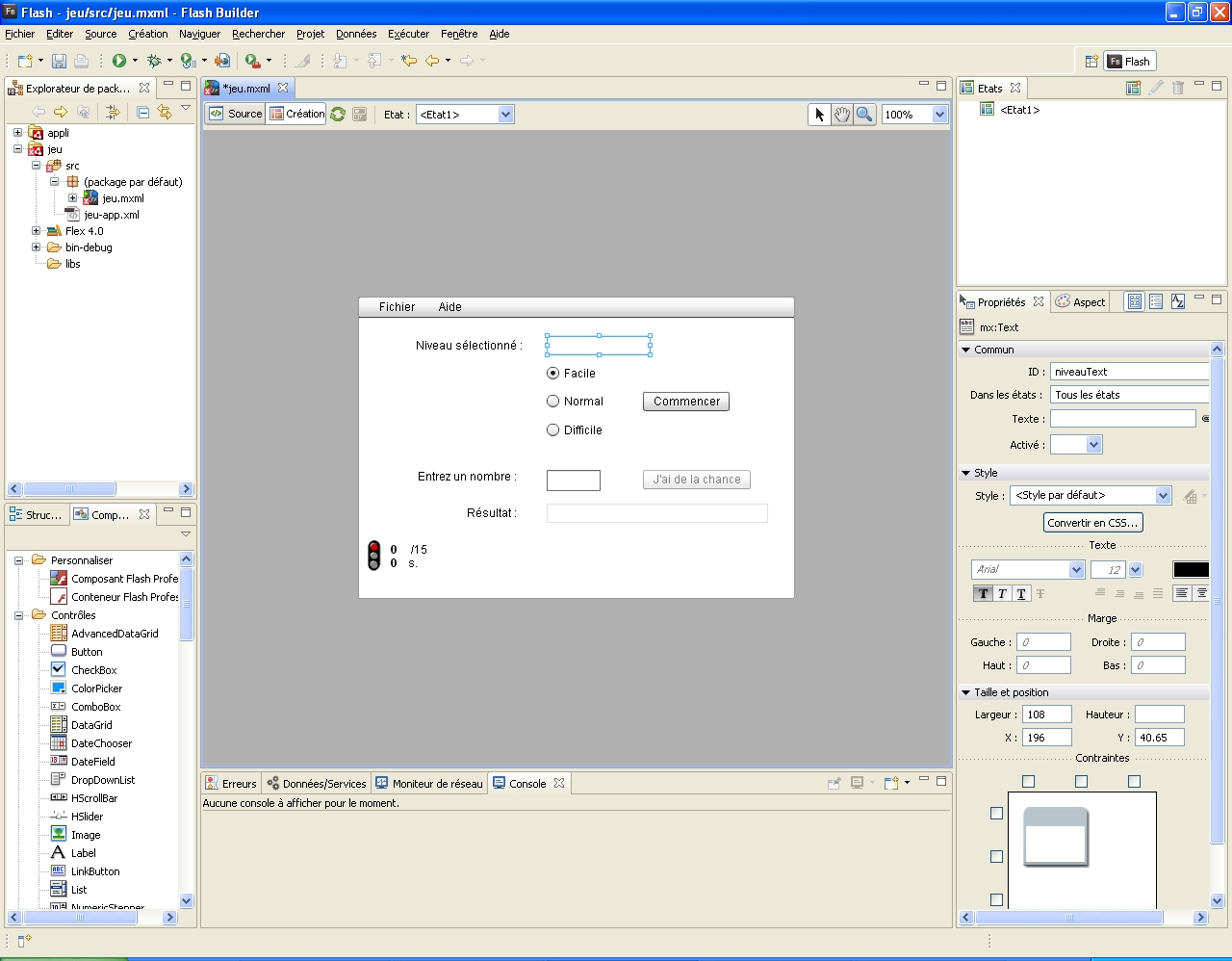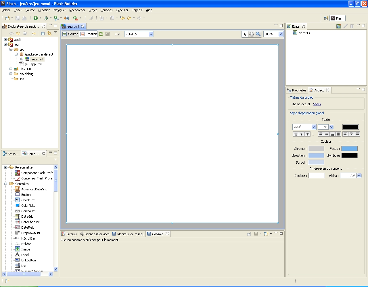 Lorsque vous double-cliquez sur jeu.mxml, un nouvel onglet va s'ouvrir, cet onglet contient des sous-onglets "Source" et "Création". En gros la source c'est le code qui permet de représenter la "création".