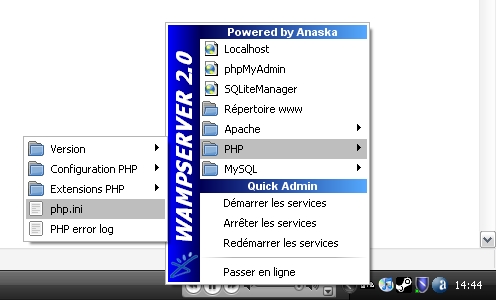 Une fois cette vérification effectuée, il vous faudra aller dans le fichier de configuration de PHP (nommé "php.ini"). Pour ceux qui utilisent Wamp, vous avez juste à aller dans ce menu pour y accéder.