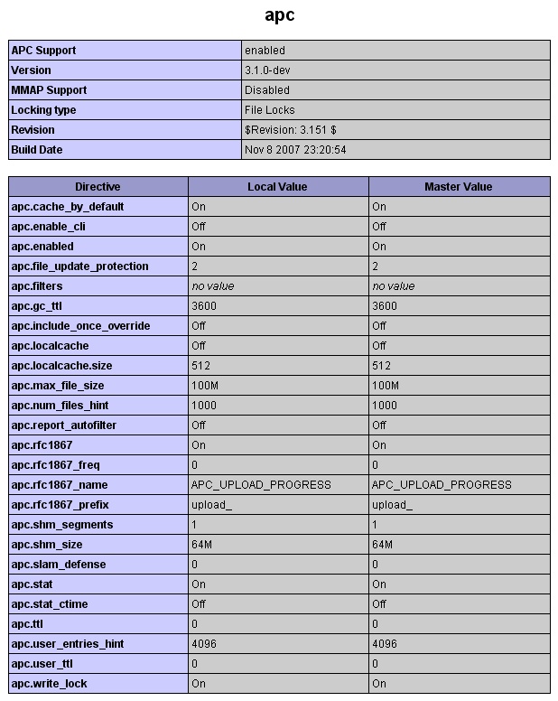 Pensez bien à vérifier que l'extension est active en regardant la première ligne, celle-ci doit indiquer enabled comme sur l'image ci-dessus. Autre chose, la constante apc.rfc1867 doit être à On ou bien vous ne pourrez vous servir de la principale fonctionnalité d'APC (autrement dit, la progression de l'upload d'un fichier).