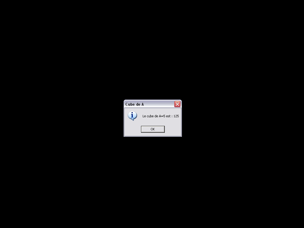 BOITE DIALOGUE "Cube de A","Le cube de A=5 est : "+str$(A)Appuyez sur F5 et voyez le résultat !