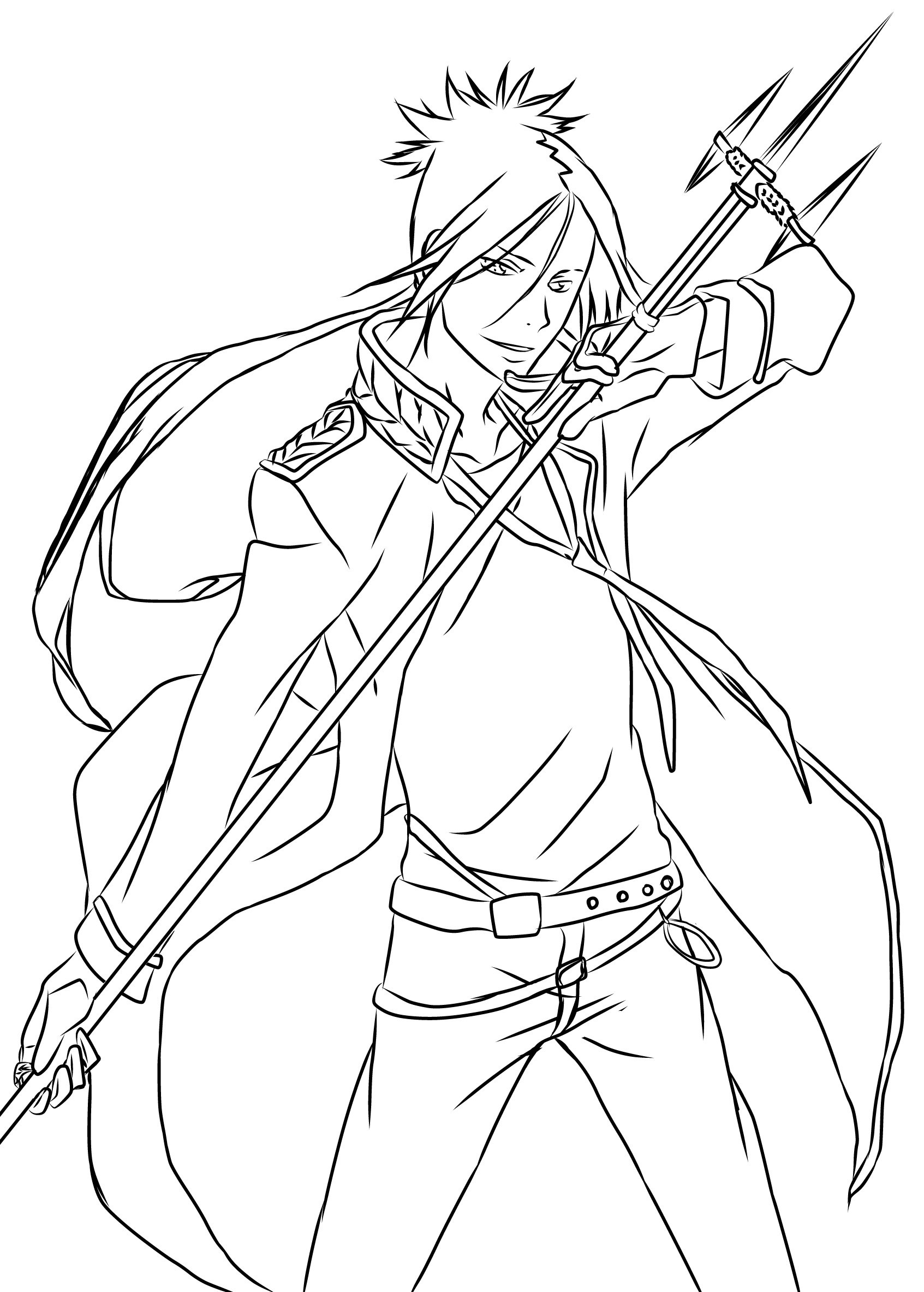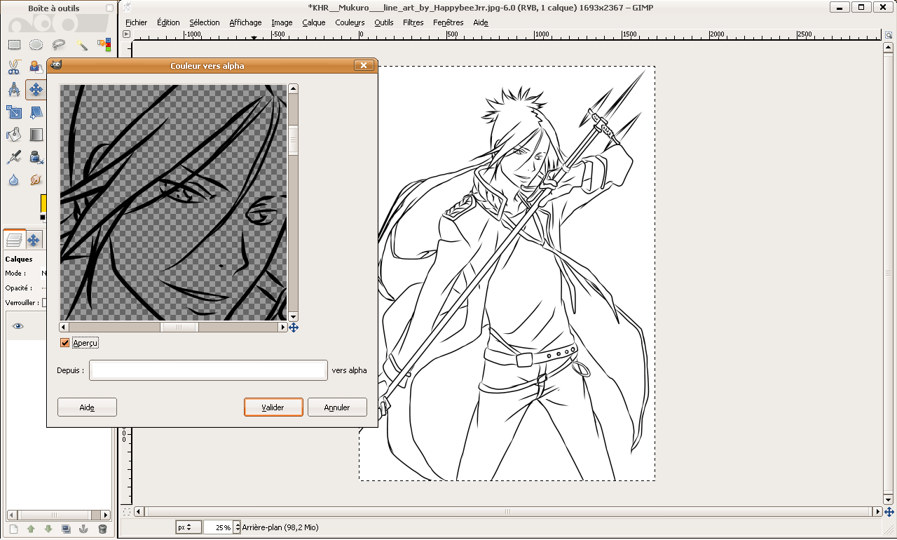 Bien, cela est fait, vous pouvez maintenant chercher un line art créé préalablement ou sur un site tel que www.deviantart.com . Je vous suggère de bien le choisir car vous passerez beaucoup de temps dessus, pourquoi ne pas en chercher un représentant un personnage que vous aimez ;) . Voici celui que j'ai choisi : Mukuro Rokudo de la série "Katekyo Hitman Reborn ! " d' Amano Akira. Line art par HappybeeJrr. Je suis tombé dessus par hasard, le personnage avait une bonne tête alors après avoir contacté l'auteur pour lui demander l'autorisation de l'exposer dans un tutoriel, j'ai choisi celui-ci. Ah... oui... pendant que j'y suis, je pense que l'auteur de votre line art aimerait voir celui-ci colorié, alors n'hésitez pas à lui montrer votre coloration une fois finie ^^ .