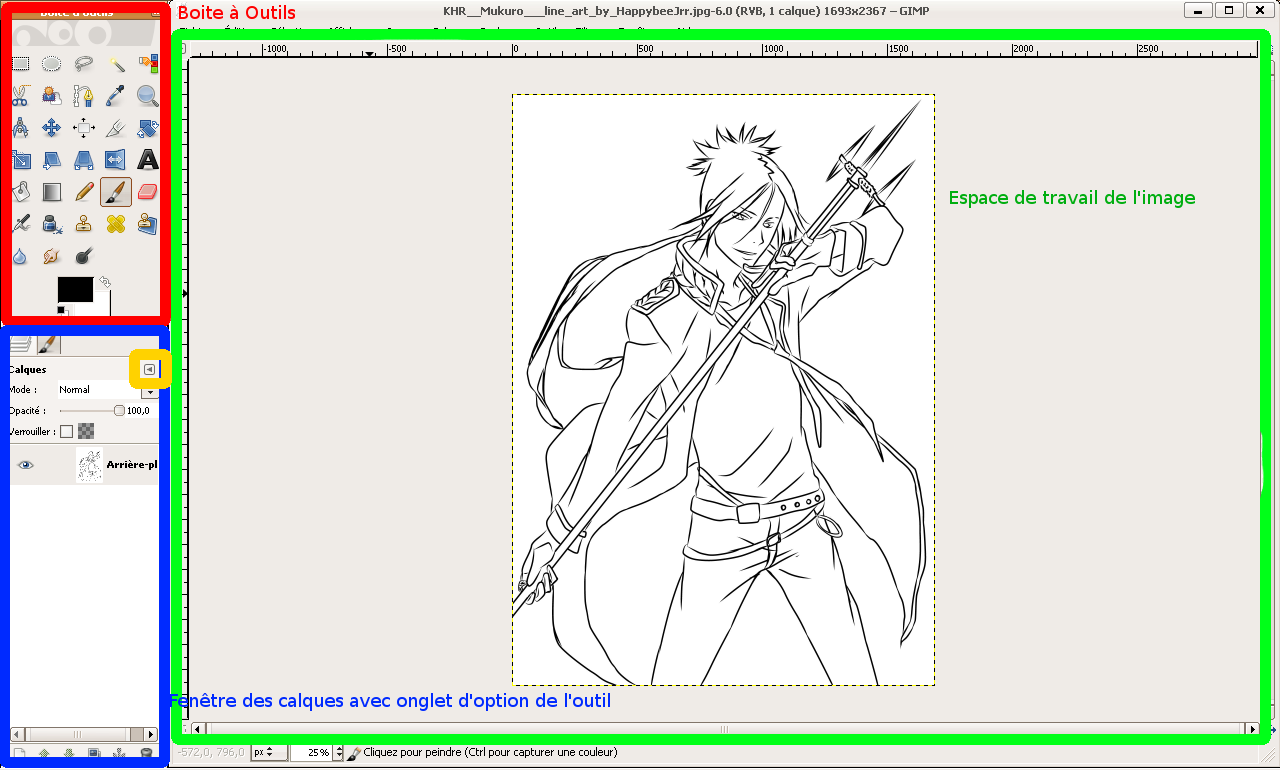 Bien, pour commencer, il faut aller chercher votre line art à l'endroit où vous l'avez enregistré. Pour ce, il suffit de faire une fois "Gimp" lancé: "Fichier -> Ouvrir..." et de trouver votre image sur votre ordinateur. Passons à l'optimisation de l'espace de travail, je vous propose de configurer Gimp comme cela pour travailler :