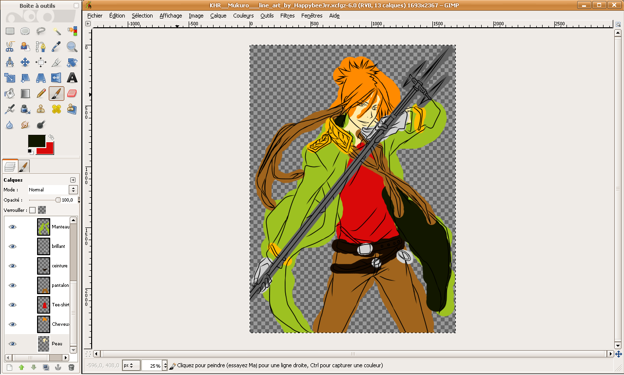 Et les prérequis : - "The Gimp". La version utilisée pour ce tutoriel est Gimp 2.6.7 . - Un line art. - Une souris, un clavier et un écran branchés sur votre ordinateur ;) - Du temps. - De la patience. - Un dossier bien organisé pour enregistrer ses créations et travailler dans un espace optimisé.