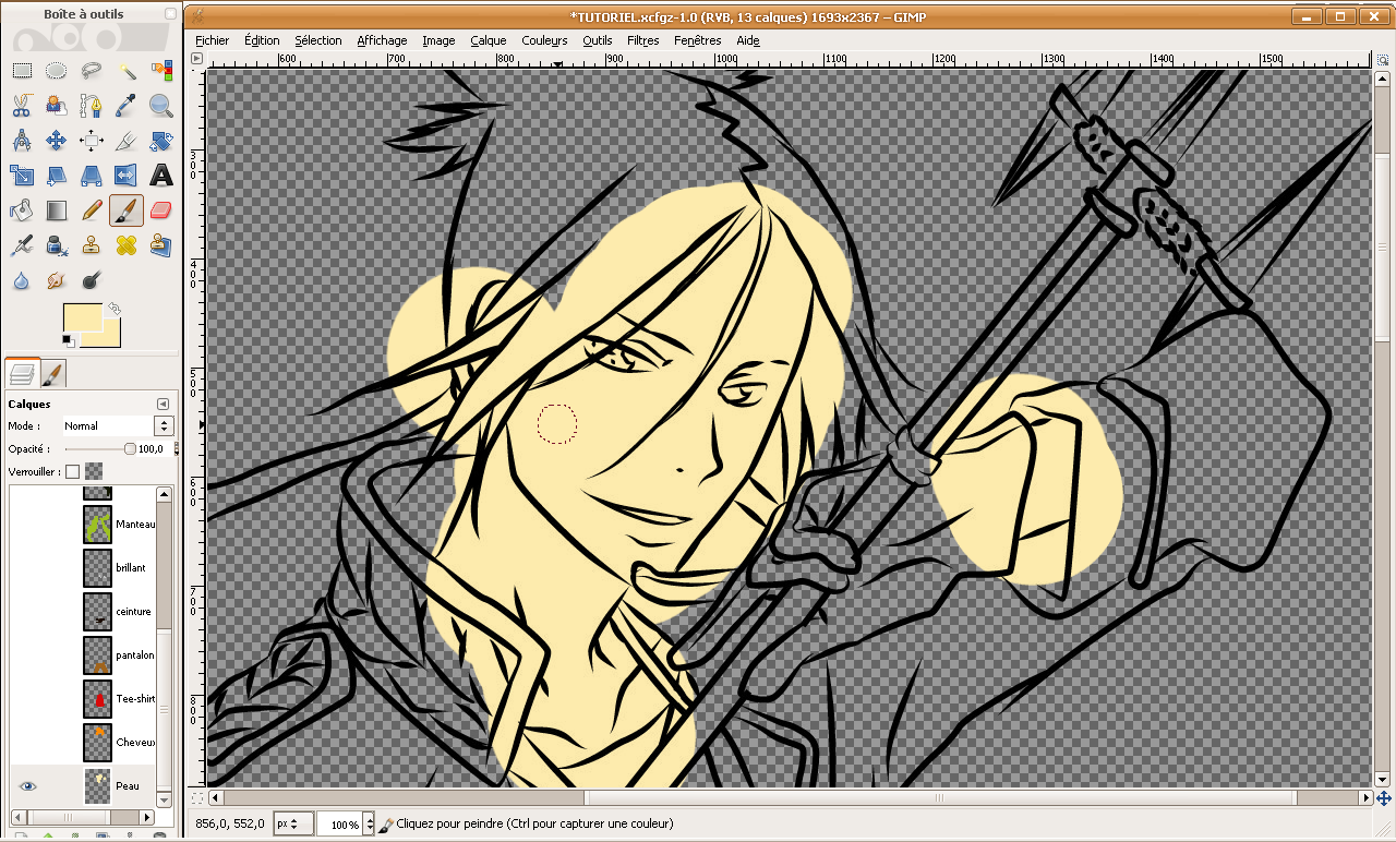 Bien, pour commencer, assurez-vous que vous n'avez bien que le calque du line art dans votre boite de Dialogue des Calques. Ensuite, coloriez le avec le pinceau (P) avant de passer à la suite.