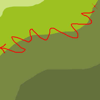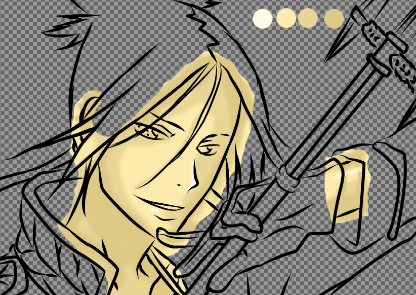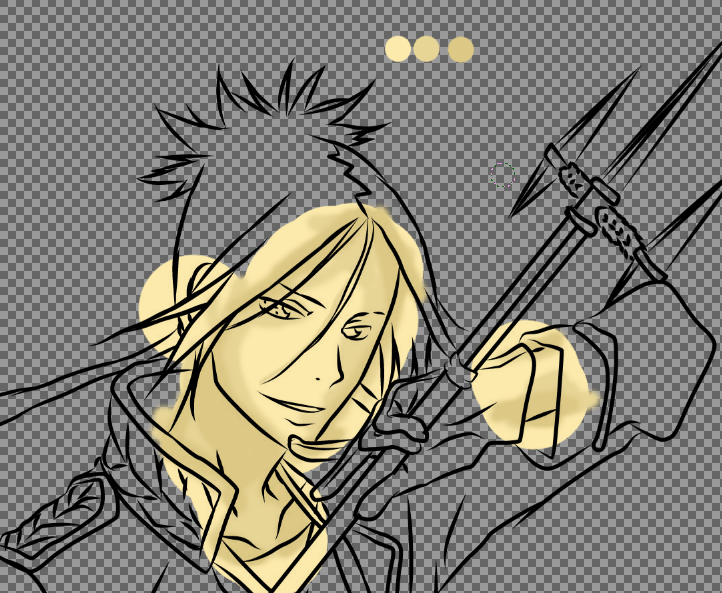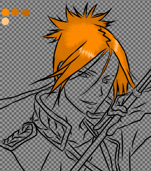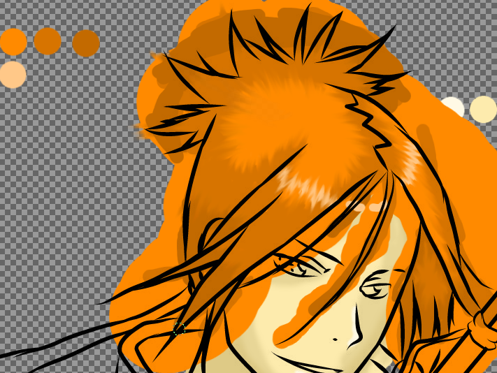 Vous allez maintenant donner ce petit effet aux cheveux (ou a la fourrure) de votre line art : - Premièrement, choisissez votre palette de couleurs (ce que vous pouvez voir sur l'image précédente sous forme de ronds pleins) en prenant des couleurs plus sombres que votre couleur d'origine et optionnellement une couleur plus claire très proche du blanc pour donner un effet brillant. - Ombrez, selon le même principe que celui de la peau, en fonction de la lumière visualisée. - Enfin, servez vous de l'outil de barbouillage (S) avec une brosse relativement petite pour faire des mouvements de va-et-vient comme suit :