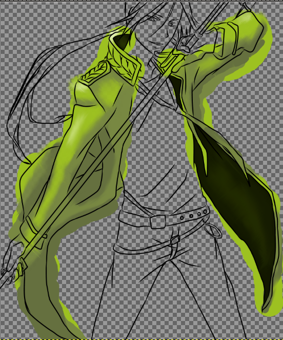 Comme je le disais, la gomme est là pour effacer le superflu, personnellement je ne gomme que vers la fin, ça me laisse la liberté de dépasser et donc de gagner du temps, car on n'y passera pas qu'une seule fois sur ce calque... Bien, ensuite, créez un nouveau calque pour un vêtement par exemple, coloriez et nommez-le. Faites pareil pour chaque éléments distincts, voilà à quoi j'en arrive de mon côté :