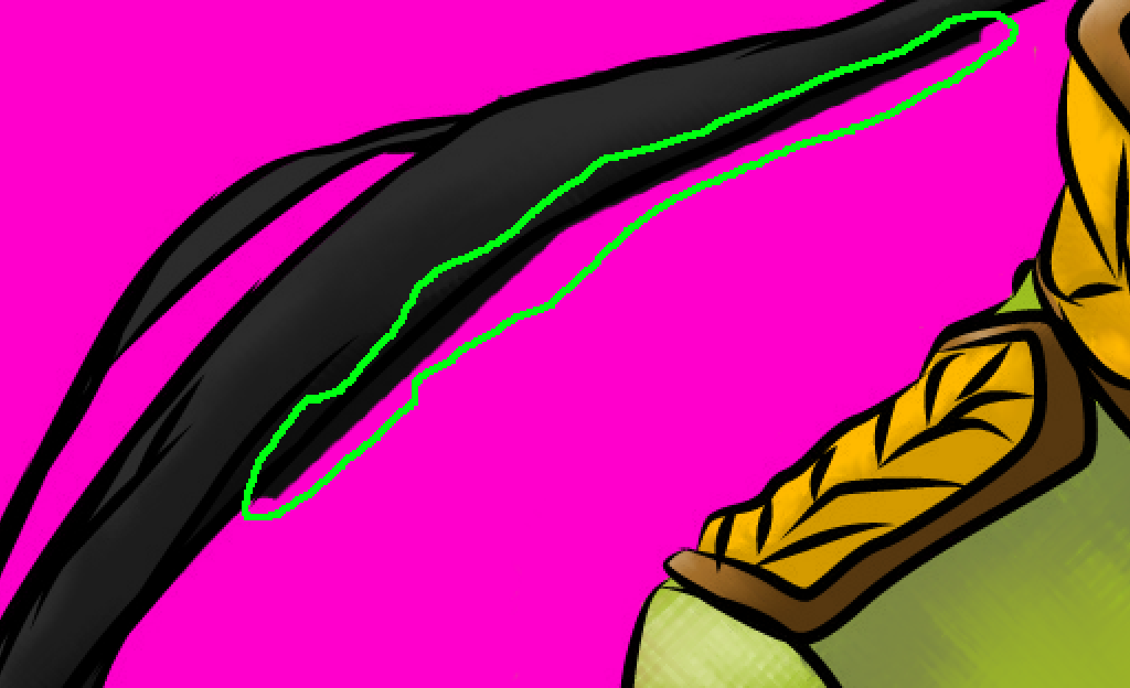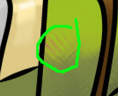 Une grande partie de mon personnage étant verte et les motifs étant jaunes, il est évident que mon calque "fluo" ne sera ni vert ni jaune (retenez bien la leçons ;) !). Vous passerez ensuite celui-ci entre vos différents calques afin de repérer vos erreurs, elles devraient ressortir tout naturellement :