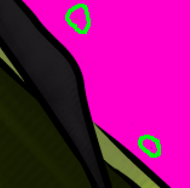Parce que l'être humain n'est pas parfait, il lui arrive très fréquemment de faire des erreurs et le graphisme n'y échappe pas ;) . Il faut savoir que la plupart de ces erreurs ne se voient pas d'un premier coup d'œil et nécessitent quelques manipulations afin de les mettre en évidence. Sur mon personnage, j'ai relevé un total de 22 fautes (j'en relèverai encore bien plus par la suite) qui ont besoin d'être réparées. Afin de les mettre en avant, il vous faudra créer un nouveau calque que vous remplirez (Maj + B) avec une couleur "fluo" comme celles qui suivent :