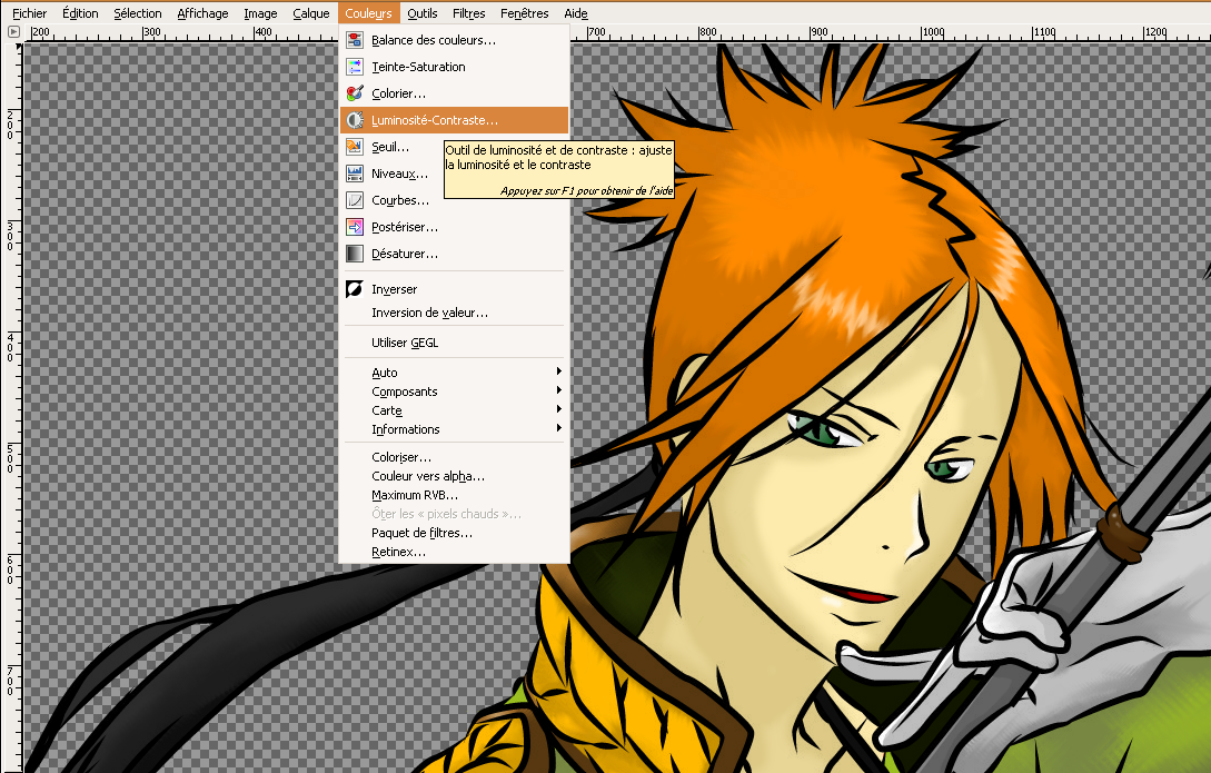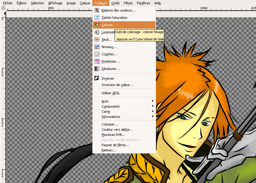 Tout ce que nous avons fait jusqu'à présent est de colorier notre personnage à l'aide des outils présents dans la boite à outils. Cependant, il faut savoir que gimp regorge d'une multitude de scripts, fonctions ou encore outils tous autant utiles les uns que les autres, ce qui peut vous permettre d'améliorer vos créations. Du moins, il n'est pas nécessaire de tout connaître : malgré le temps passé sur ce logiciel, je ne me suis pas encore servi de plus de la moitié des fonctionnalitées de gimp ;) . J'aimerais, pour en finir avec ce tutoriel sur les "trucs basiques" du coloriage, vous faire part de deux fonctions se trouvant dans le menu "Couleurs". En effet, je vous ai dit précédemment que la couleur de la peau ne me convenait pas et que j'allais y remédier...
