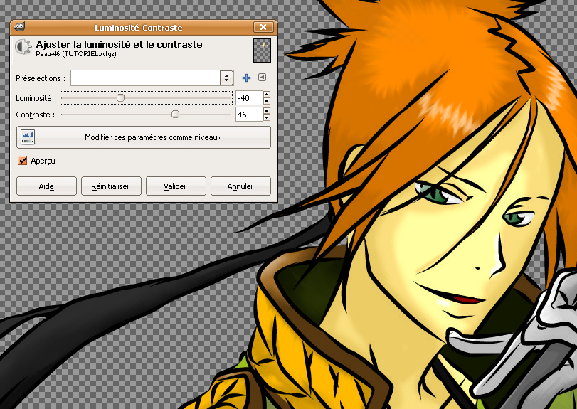 Eh bien détrompez-vous! Si jamais une des couleurs ne vous satisfait pas sur votre création, vous pouvez toujours la changer grâce aux calques : 1 - On veut une peau moins blanche. 2 - On va dans "Couleurs"->"Luminosité-Contraste..." : 3 - On change les valeurs de saturation et de luminosité jusqu'à satisfaction sur le dessin :