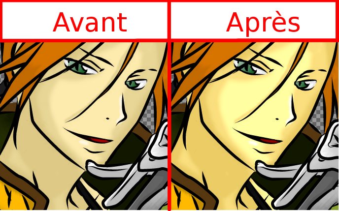 Comme pour "Luminosité-Clarté..." Vous comprendrez l'outil à force de bouger les curseurs de droite à gauche, sachant que toute modification involontaire pourra être annulée par CTRL + Z. Bien, à vous de jouer, quant à moi, j'ai essayé d'approcher mon personnage de l'original grâce à ces deux outils et voici ce que j'obtiens, avec un comparatif de l'ancienne image à côté :