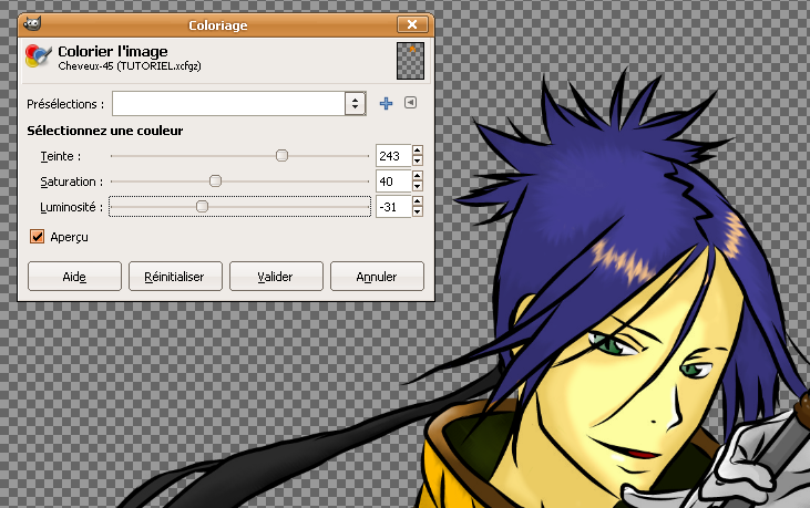 D'où l'utilité d'un second outil dans le même menu : "Couleurs"->"Colorier" : Une seconde fenêtre apparait, on note que la boite de dialogue contient "luminosité" et "contraste", qui fonctionnent de la même manière que vu précédemment. Ce qui nous intéressera, ce sera le premier curseur "Teinte". Ce dernier permettra de donner une nouvelle teinte à l'élément sélectionné via le calque, les deux autres curseurs "ajusteront le tire" afin d'obtenir une couleur satisfaisante. Pour illustrer l'outil, je vais essayer de reprendre les vrais couleurs du personnage de Rokudo Mukudo : Commençons par les cheveux, il faut savoir que l'outil est très malléable, il faudra ajuster longtemps les curseurs afin d'être satisfait :