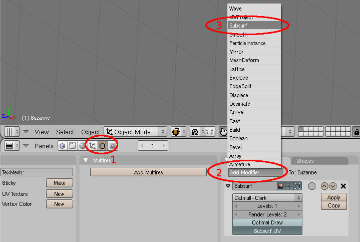 Maintenant, sélectionnez Suzanne, et ajoutez un modificateur subsurf pour que Suzanne soit plus belle. :-° Il faut aller dans le menu Editing (touche F9).