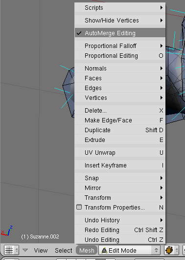 Donc, on passe en Edit Mode avec la touche Tab, et on active les deux options dont je vous ai parlé au chapitre précédent. Un bref rappel : l'AutoMerge Editing dans le menu Mesh, et le petit aimant en fer à cheval dans la barre de la vue 3D.