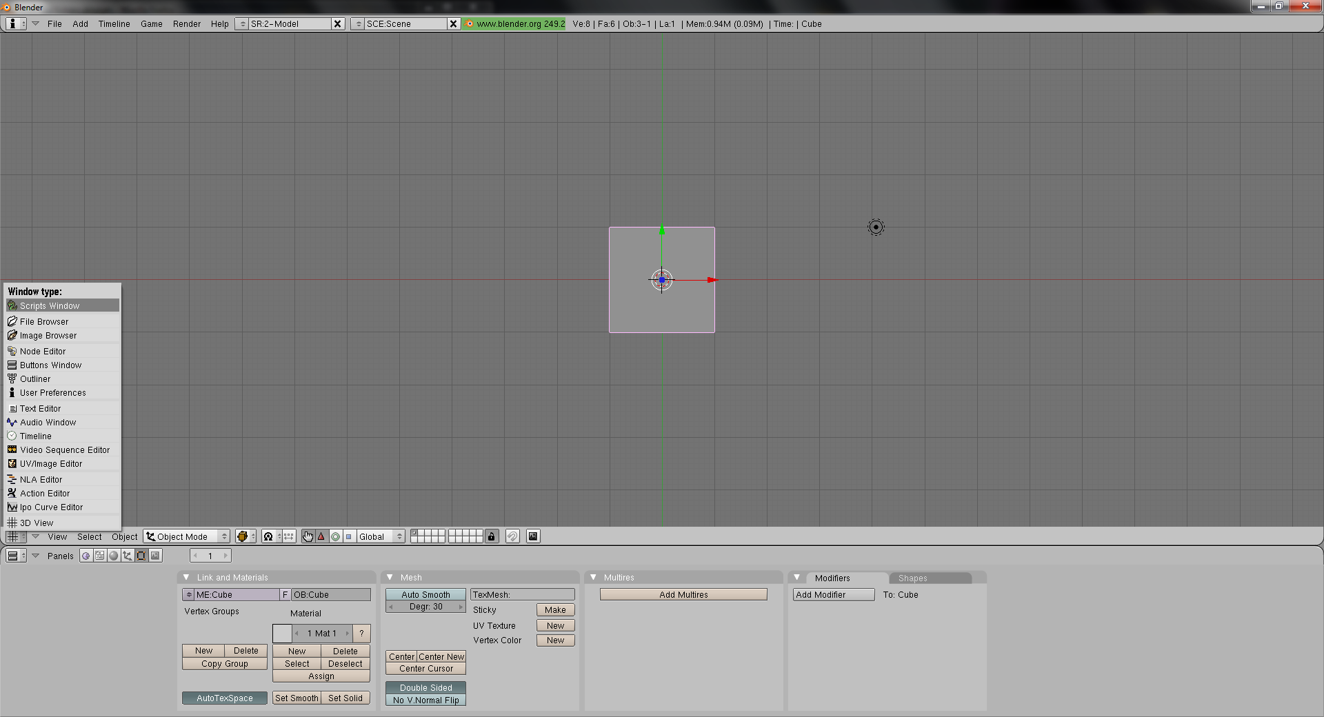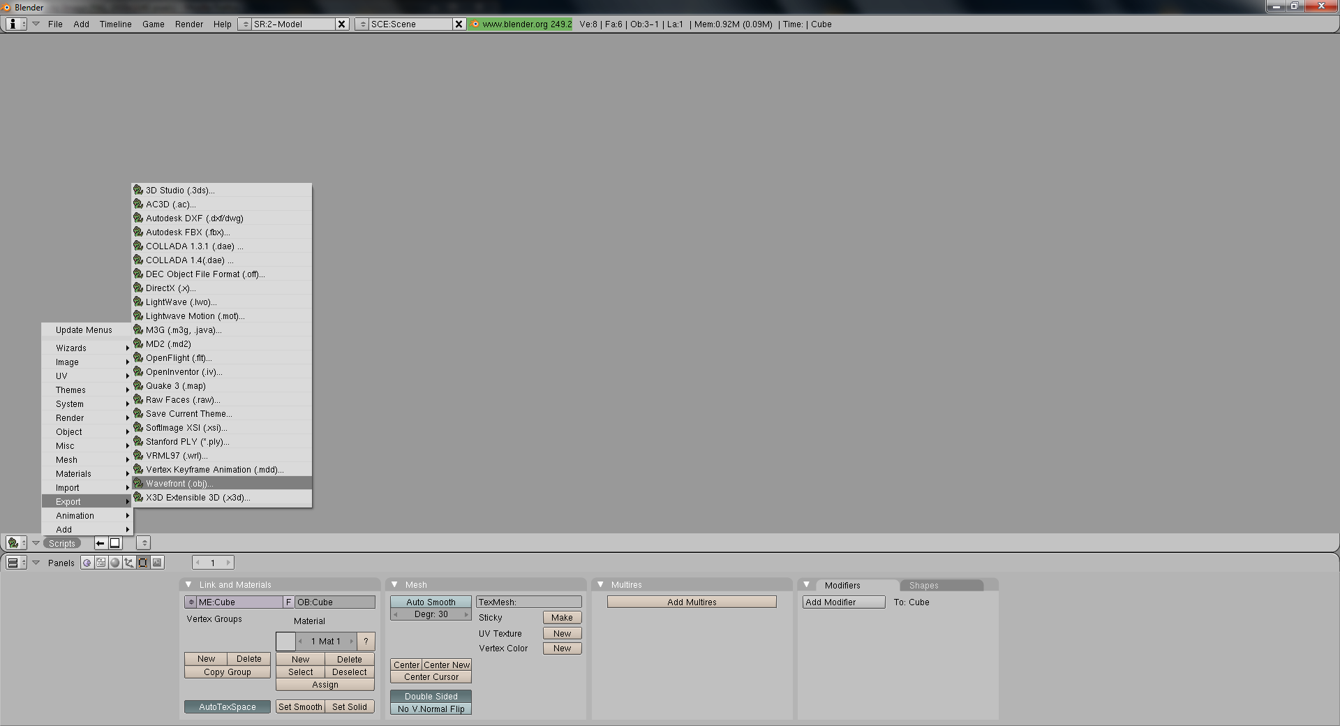 Nous allons commencer par exporter un modèle. Si vous en avez un sous la main, prenez-le, sinon faites un cube (ou prenez celui par défaut de Blender). Maintenant changez de vue pour choisir le menu "Scripts Window" (cliquez pour agrandir) : Dans le bouton "Scripts" choisissez Export > Wavefont (.obj) :