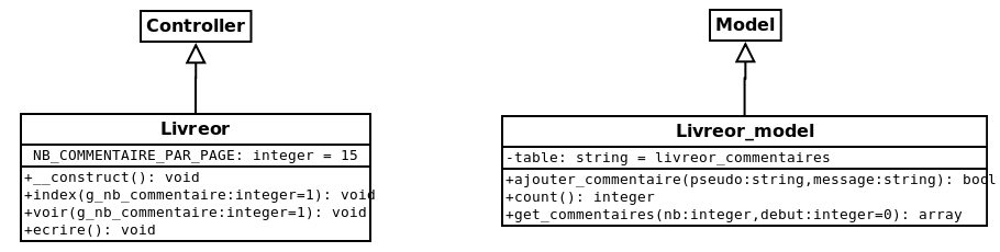Les deux variables seront initialisées au constructeur. Elles pourront être modifiées par deux méthodes. Le titre par défaut sera composé du nom de la méthode du contrôleur et du nom du contrôleur, séparés par un tiret. Pour cela, nous allons utiliser les attributs de la bibliothèque Router. La variable $charset permettra l'affichage des caractères dans le bon encodage. Elle sera initialisée avec la même valeur que celle définie dans le fichier ./application/config/config.php.