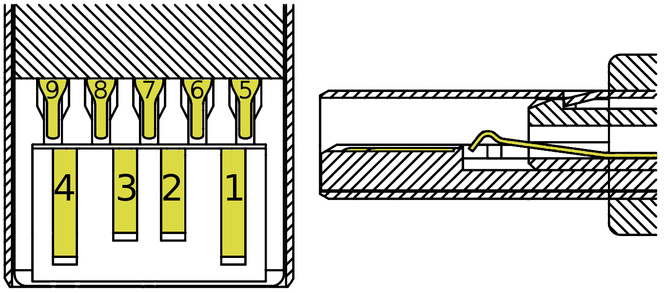 En 8 et 9, ce sont les contacts StdA_SSTX- et StdA_SSTX+ qui servent à l'émission (pour l'ordinateur) en mode Superspeed.