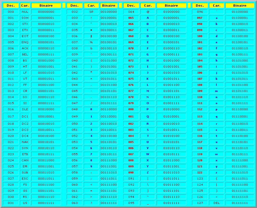 A présent, nous pouvons convenir par exemple que : 01000001 (binaire) => 65 (décimal) => A ; 01000010 (binaire) => 66 (décimal) => B, etc.