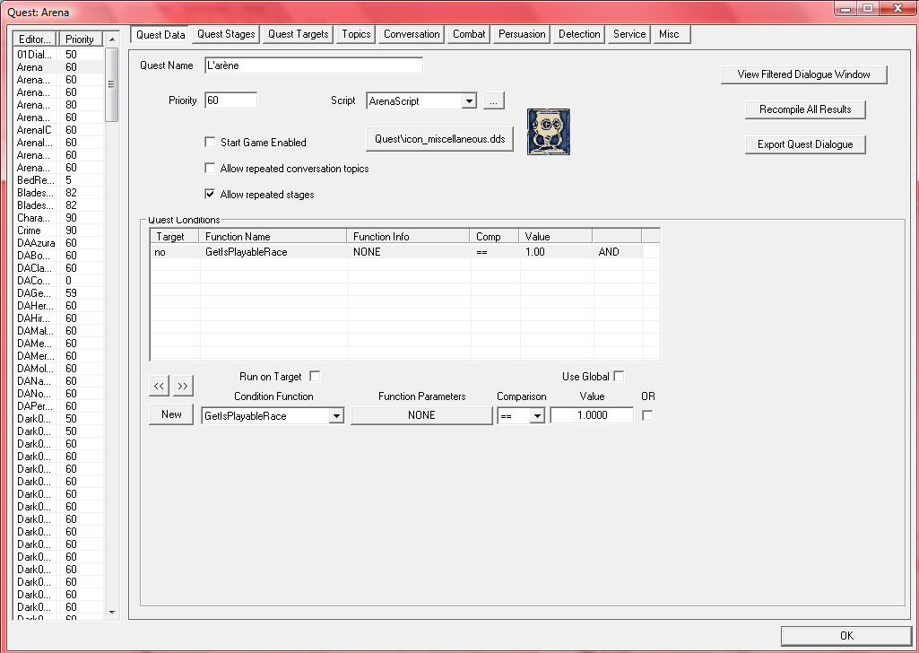 Dans la liste de gauche, vous pouvez apercevoir les ID de toutes les Quests du jeu.