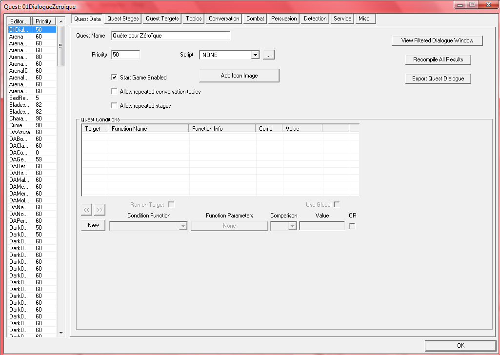 En fait, une Quest n'est pas une Quête comme on pourrait le croire mais juste tous les dialogues d'un personnage. Mais c'est aussi grâce aux Quests que nous créerons des Quêtes.