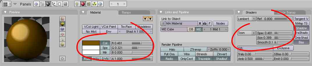Pour le tronc, rien de plus simple : sélectionnez le tronc, faites F5 pour accéder au panel des matériaux, puis faites "Add new" pour assigner un nouveau matériau à notre tronc. Pensez à renommer votre matériau, c'est préférable pour mieux s'y retrouver (quoiqu'ici ce n'est pas très important). Changez les couleurs, et dans la partie "Shaders", changez "CookTorr" par "Toon" pour donner un effet cartoon à notre matériau. Ajustez les valeurs selon votre goût !