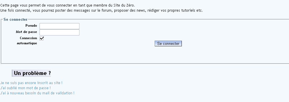 Ce chapitre traitera de la connexion. Il y aura un formulaire demandant pseudo et mot de passe, ainsi qu'un bouton Connexion automatique qui utilisera les cookies.