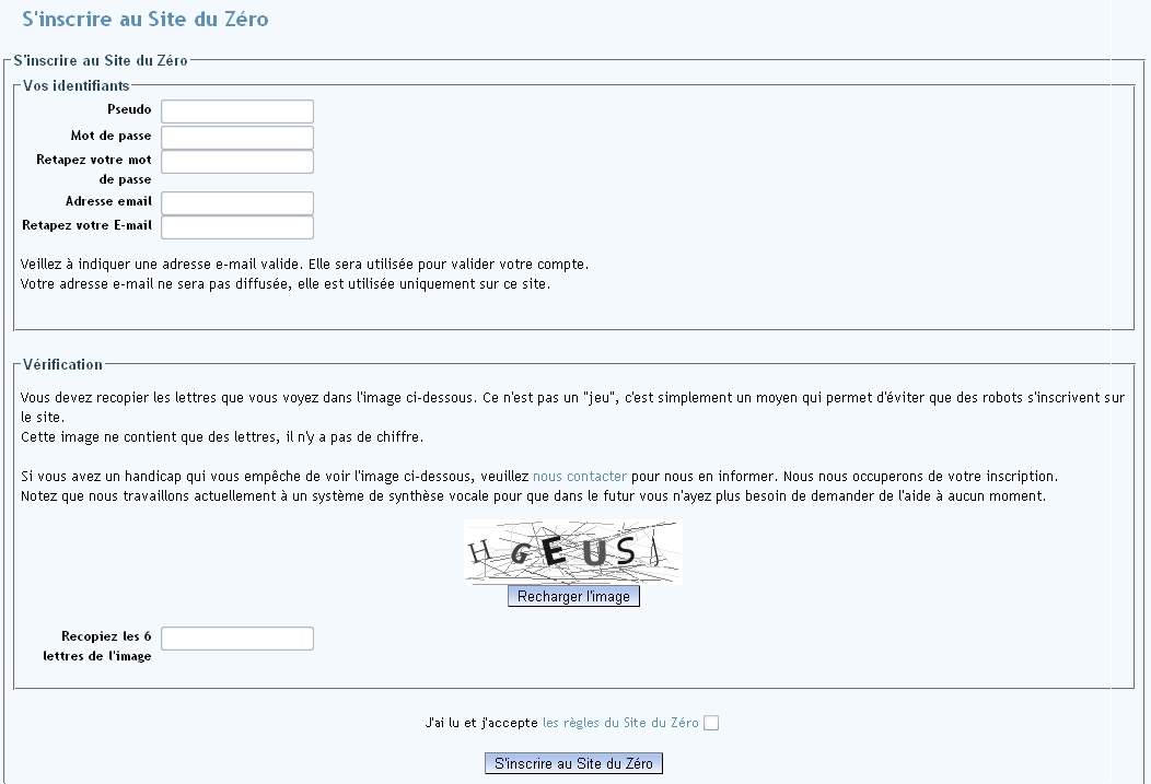 La première page du système proprement dit contiendra le formulaire d'inscription, la deuxième, la page de vérification. Comme ce sera le début, nous devrons aussi vous faire coder d'autres fonctions qui nous serviront tout au long de cette partie. Le formulaire d'inscription contiendra les éléments suivants :