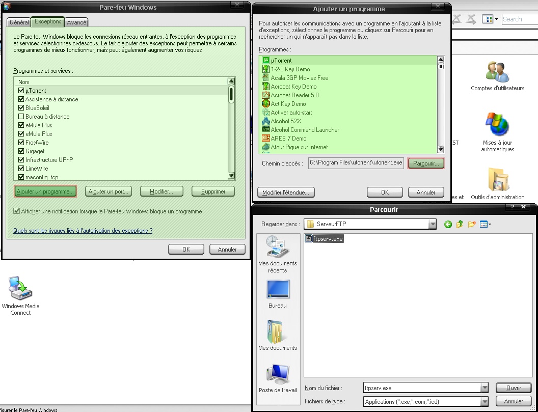 N'ayez pas peur, voici la solution. Cliquez sur démarrer => Panneau de configuration => Connexions réseau et Internet et choisissez Pare-feu Windows. Une fenêtre s'affiche, vous choisissez l'onglet Exceptions et vous cochez TYPSoft FTP Server puis sur OK.
