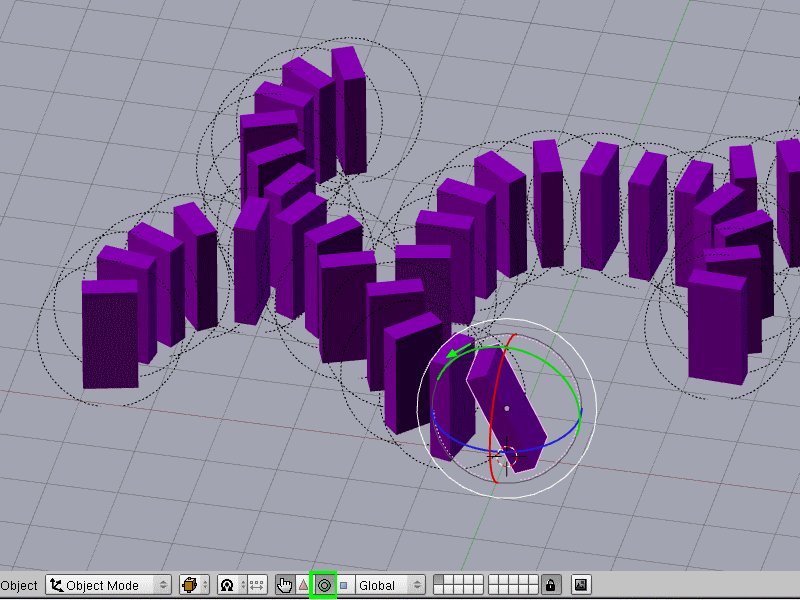 Bougez un peu la vue en maintenant la molette enfoncée, puis utilisez le widget rotation, pour incliner votre domino pour qu'il fasse tomber tous les autres !
