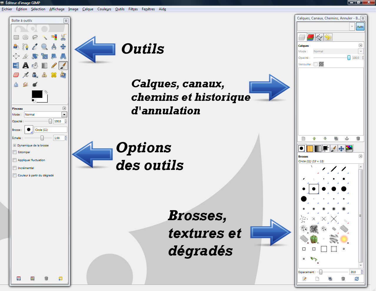 4:Boîte de calques : fenêtre très importante qui regroupe les calques mais pas seulement. Elle regroupe aussi les brosses, les textures, les dégradés, les canaux, l'historique d'annulation et les chemins. Comme la boîte à outils, vous pouvez l'enlever car elle est ancrable, mais je vous conseille également de la laisser car nous nous en servirons beaucoup.