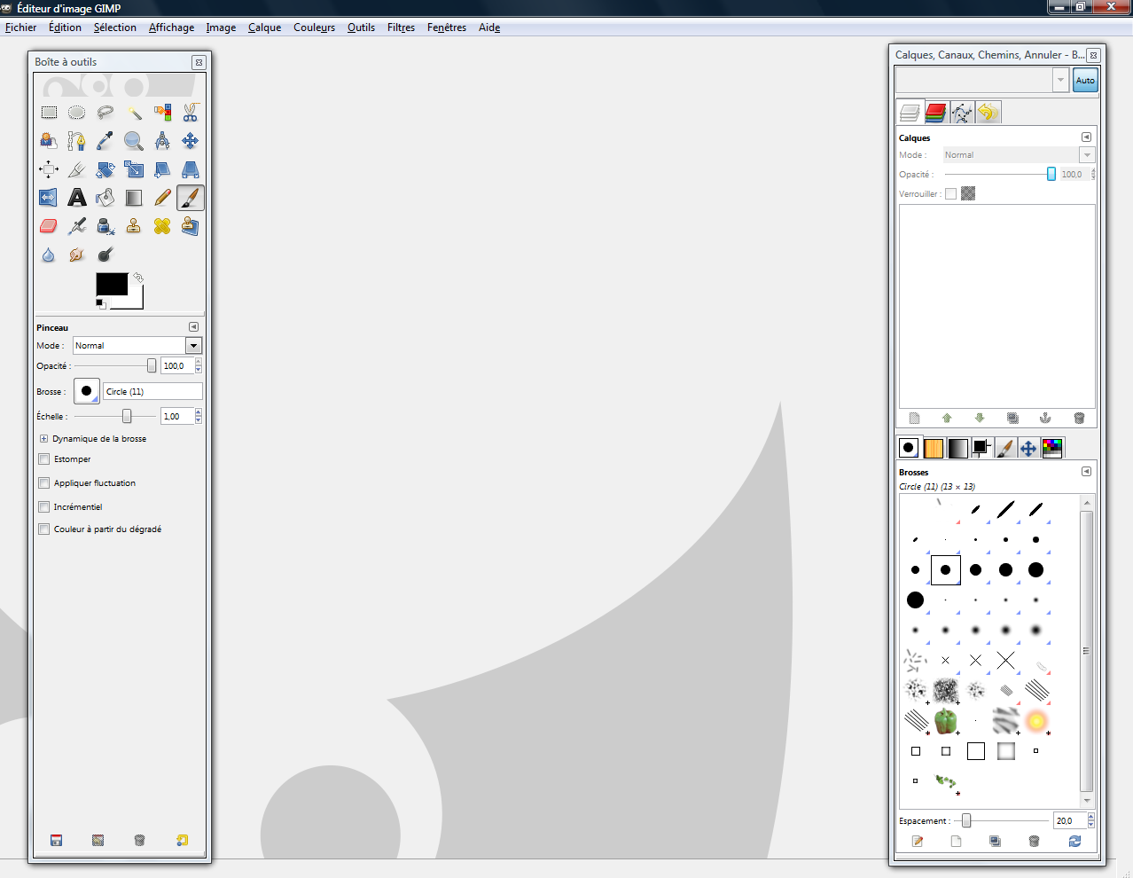 Tout d'abord ouvrez GIMP. Vous allez obtenir une fenêtre comme celle-ci: