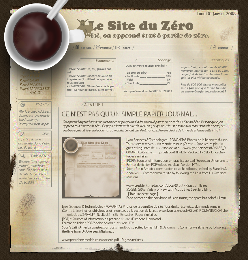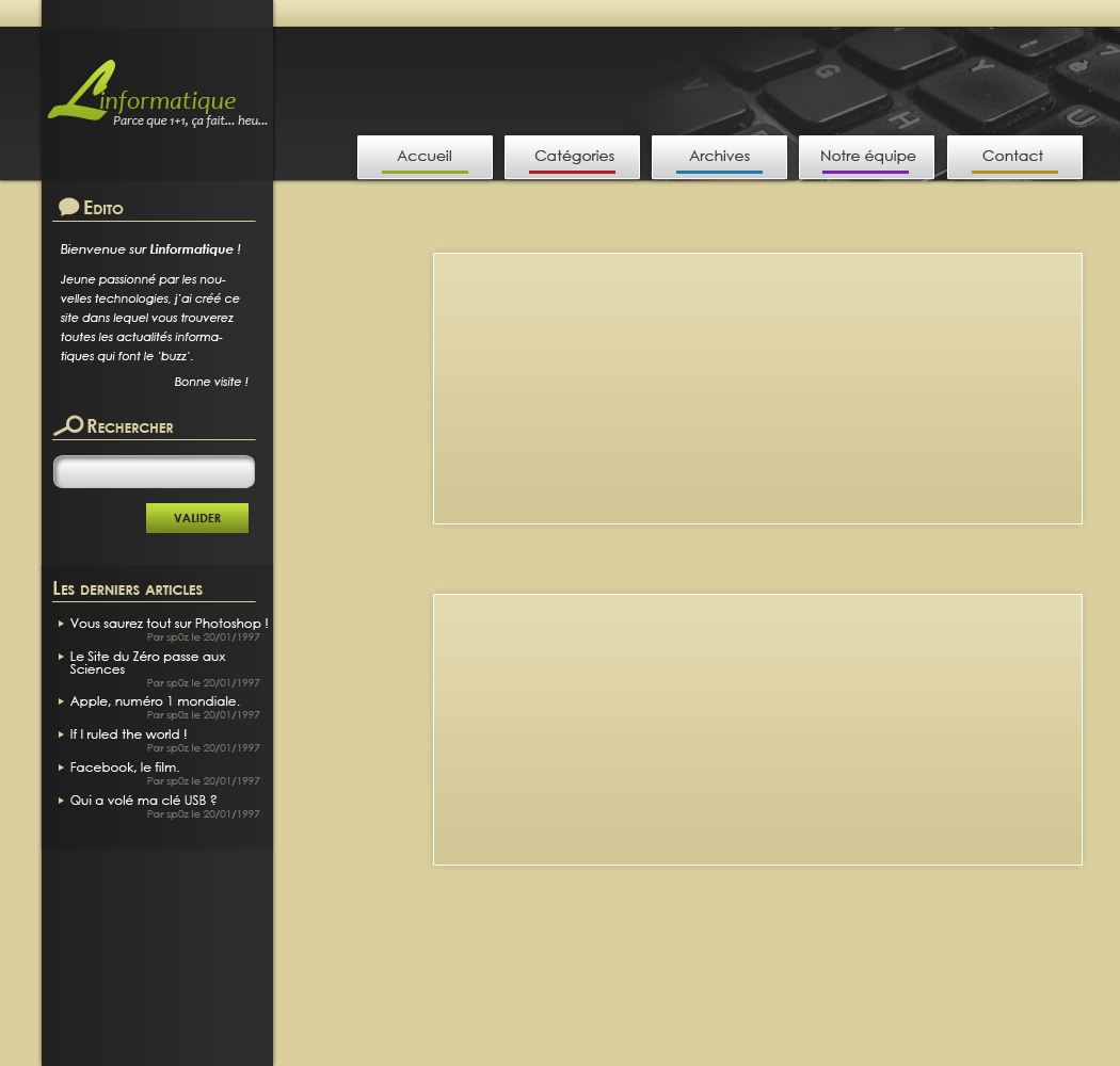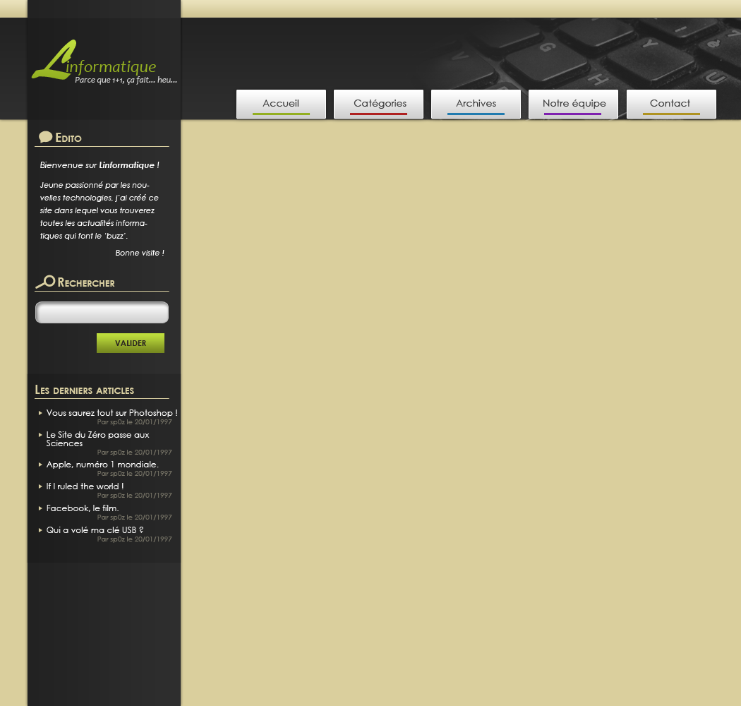La suite, vous la connaissez. Il ne reste plus qu'à remplir. Pour l'édito, il m'a juste suffit remplir l'espace libre par un texte de présentation. En ce qui concerne le moteur de recherche, un champs blanc ainsi qu'un bouton "Valider" font l'affaire. Enfin, pour les derniers articles, j'ai construit une liste avec titre de l'article, son auteur et la date de parution. Résultat :