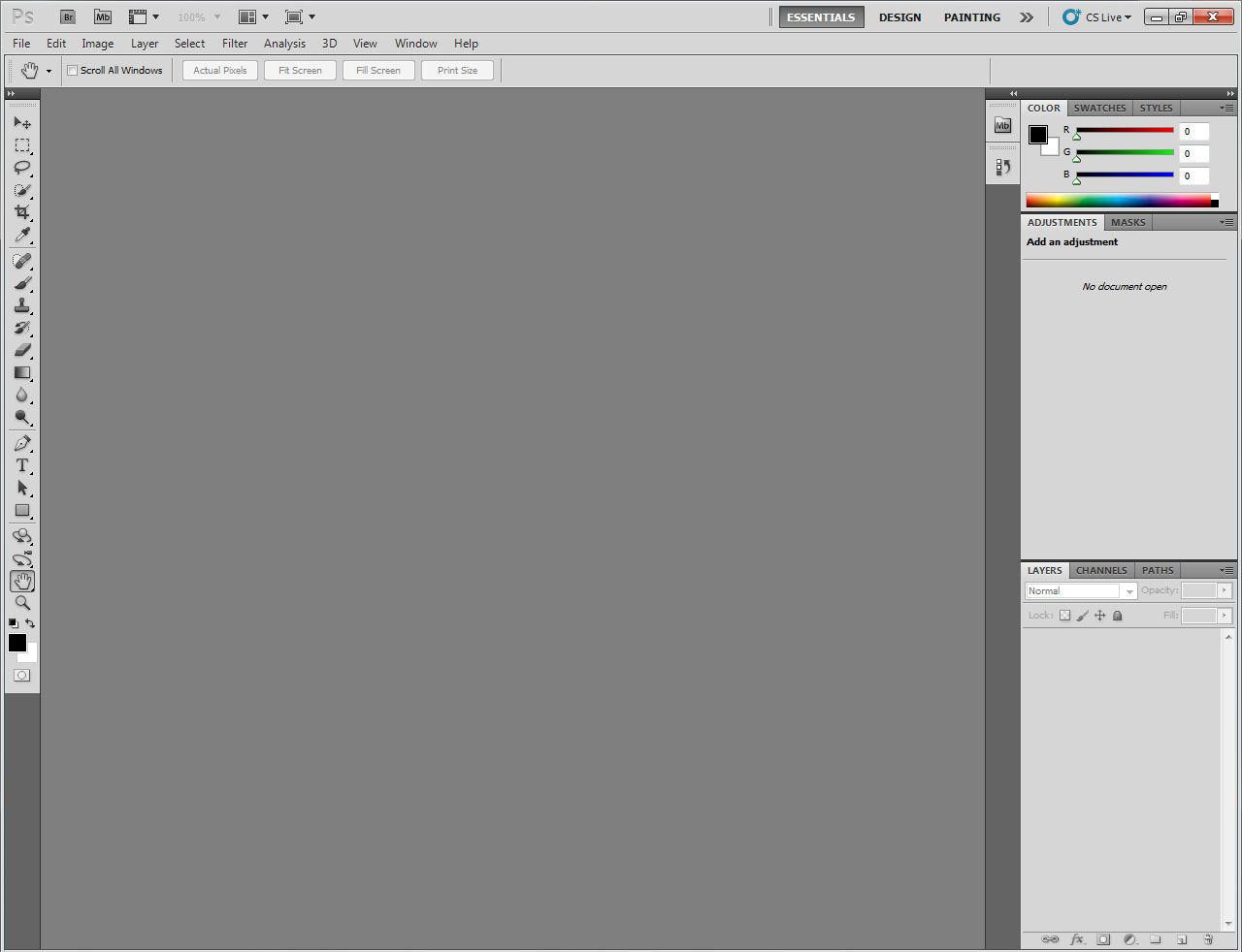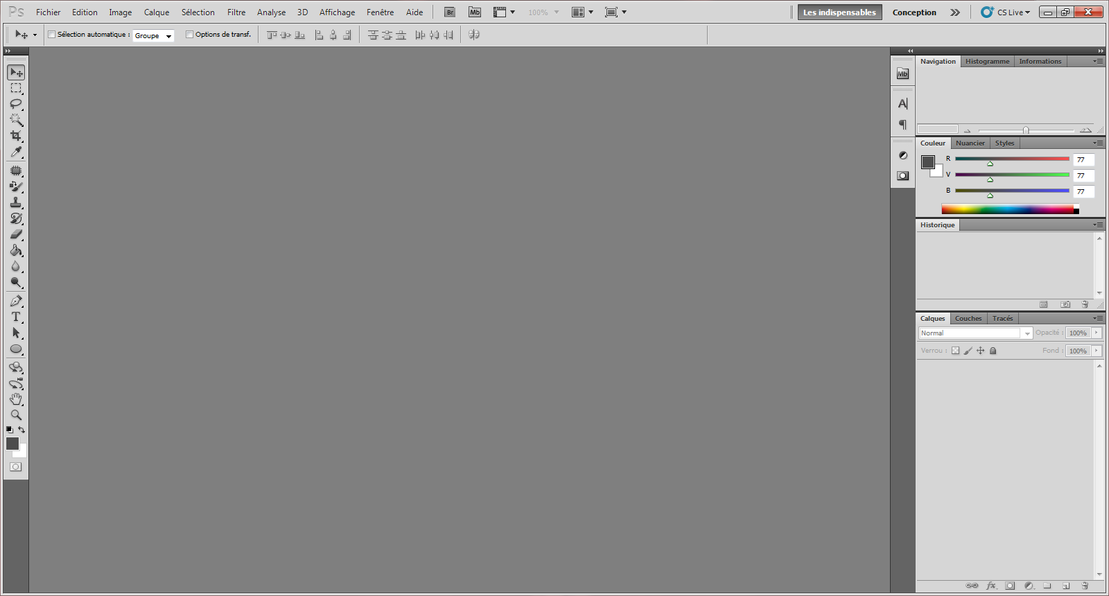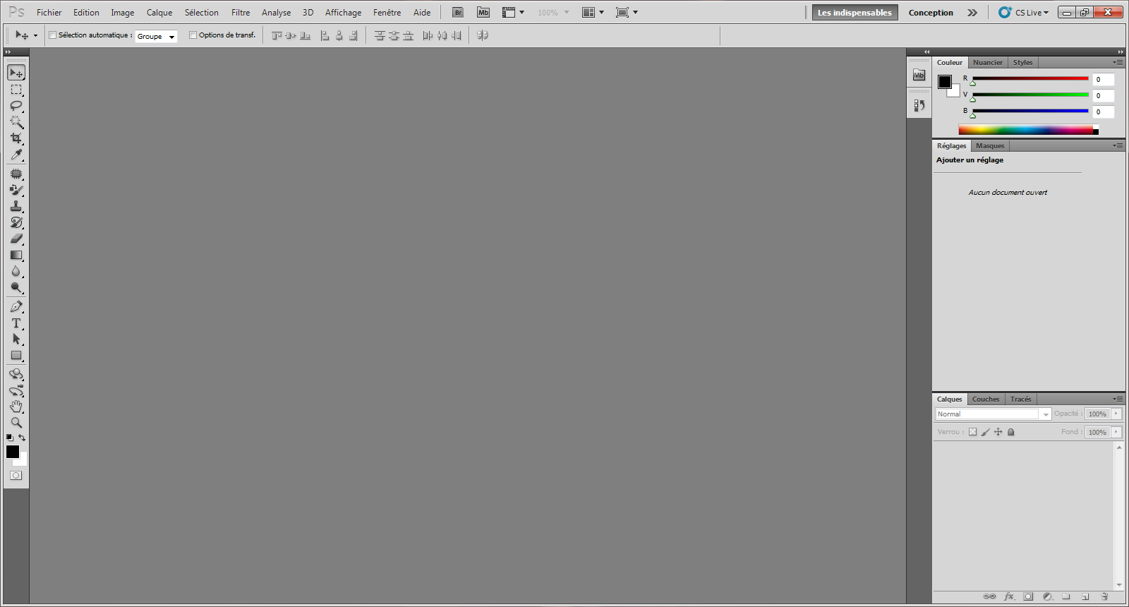L'espace de travail, c'est ce que vous pouvez voir en premier à l'ouverture de Photoshop. Il s'agit de l'interface du logiciel, c'est-à-dire cet horrible fond gris et les fenêtres de gauche et de droite (avec tous les petits boutons qui font peur aux débutants :D ).