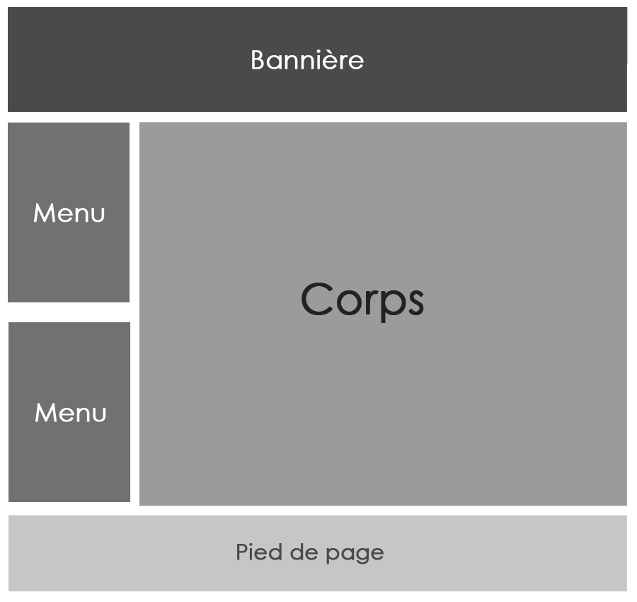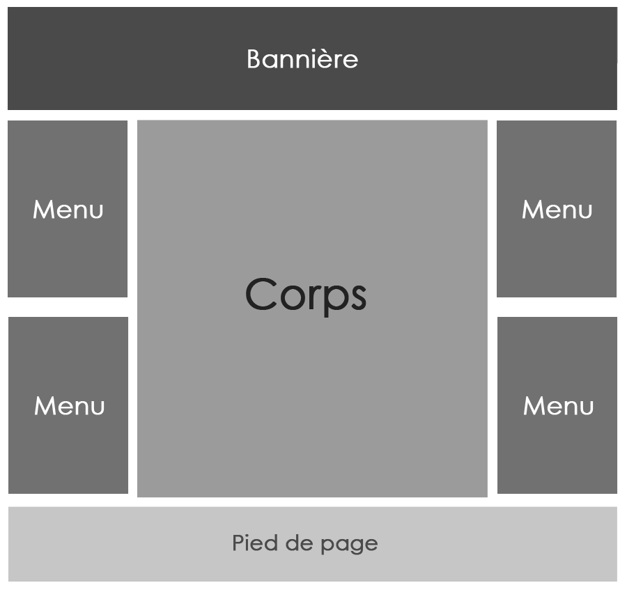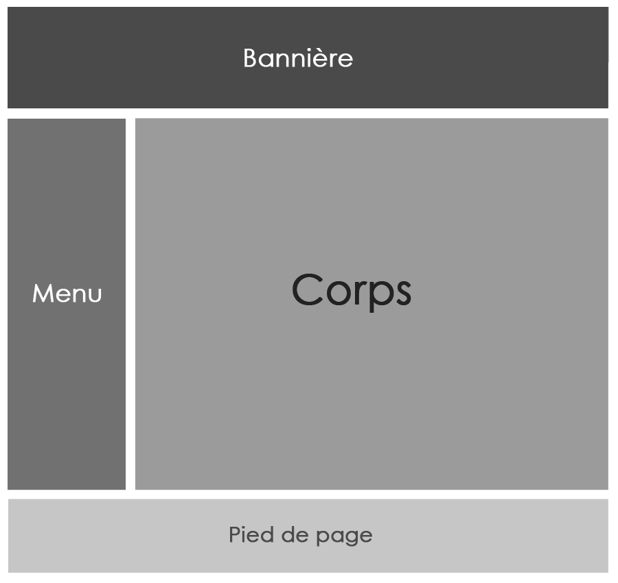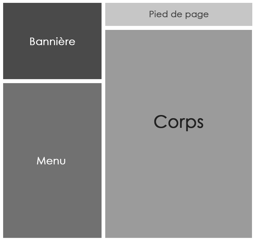 Maintenant qu'elle est prête, il est temps d'habiller cette petite maquette. Le plus souvent, on procède de haut en bas car le haut recouvre la bannière et éventuellement la barre de navigation (il n'est pas obligatoire de créer une barre de navigation horizontale, les menus verticaux peuvent suffire).