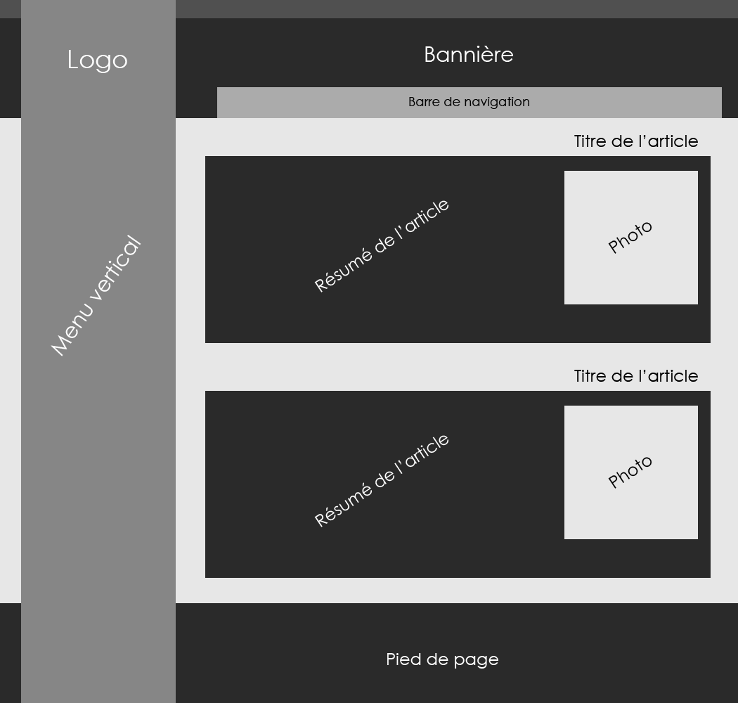 Vous le voyez, ça change un peu de la structure habituelle que je vous ai présentée dans les deux chapitres précédents. Et c'est le but ! Je vous rappelle qu'un design est personnel et que vous avez totale carte blanche à chaque fois. Ici, je me suis permis quelques folies en proposant, par exemple, un menu vertical qui vient chevaucher la bannière et dans lequel figure le logo. Bon, notez toutefois que cela existe sans aucun doute déjà sur la toile et qu'il est assez difficile de se démarquer tellement il existe de sites différents les uns des autres.