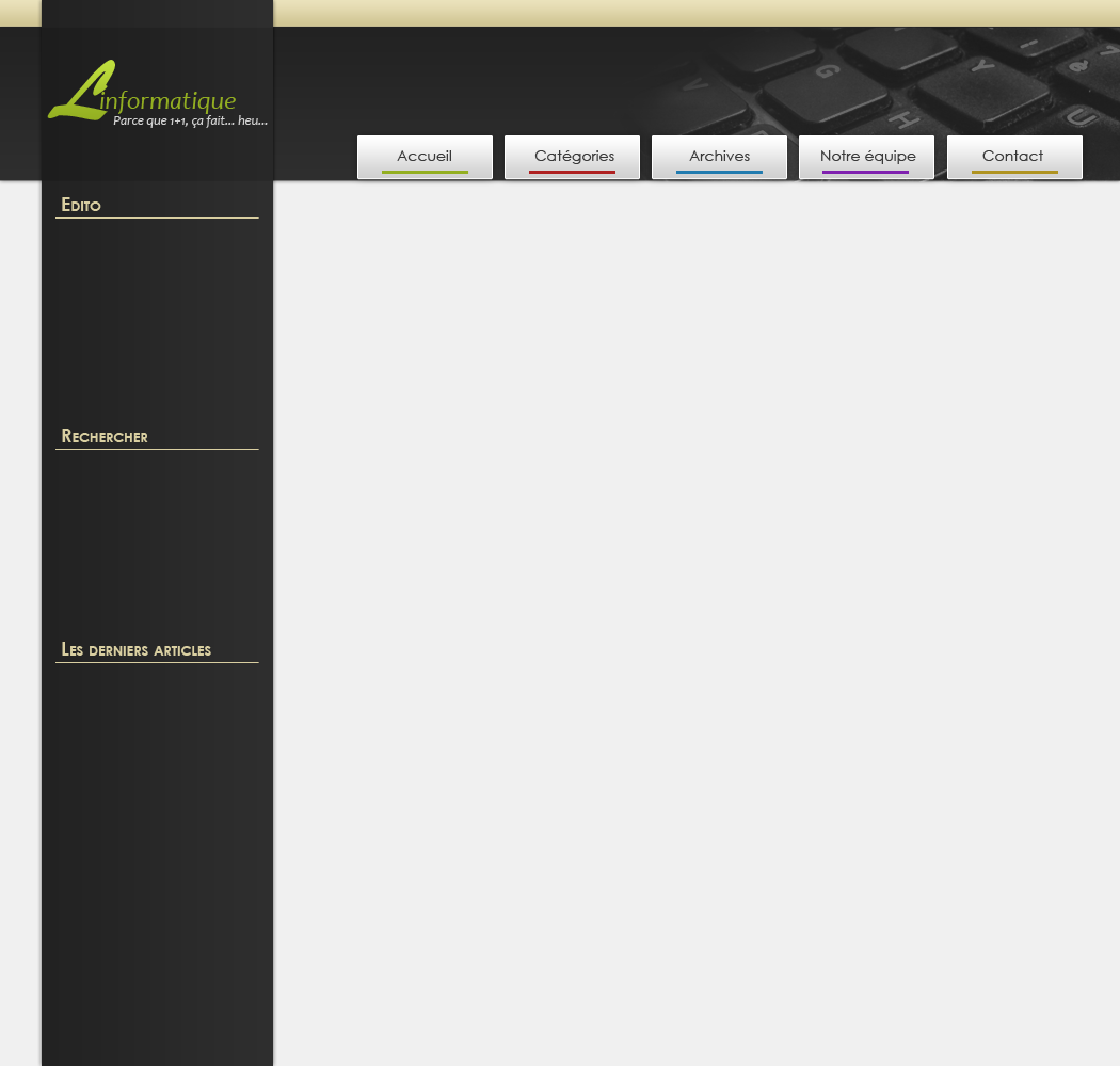 Toujours dans le but de styliser un peu plus ma charte graphique, j'ai réalisé des petites icônes représentatives que j'ai placées à côté des textes "Édito" et "Rechercher". Cela est généralement très apprécié par les visiteurs et améliore l'esthétique de votre site. Pour le menu "Les derniers articles", je me suis contenté de changer le fond de couleur pour un noir un peu plus important, à l'image de ce que l'on a fait avec le logo il y a quelques minutes.