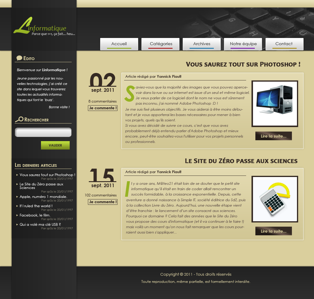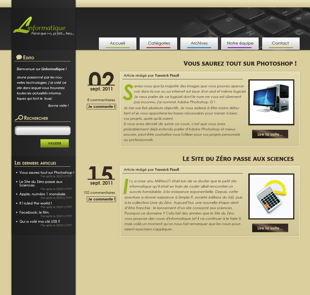 J'ai prévu un espace entre le menu et l'article pour y afficher la date de parution dans un style particulier que l'on trouve de plus en plus sur le net. En ce qui concerne l'article, j'ai suivi ce que j'avais planifié de faire grâce à ma maquette. À droite se situera une photo de présentation. À gauche de la photo figurera un résumé de l'article. En-dessous de la photo, je crée un bouton "Lire la suite" pour que les visiteurs puissent consulter l'intégralité de l'article. Pour le reste, je vous laisse découvrir et deviner comme j'ai procédé, vous en êtes tout-à-fait capable. ;)