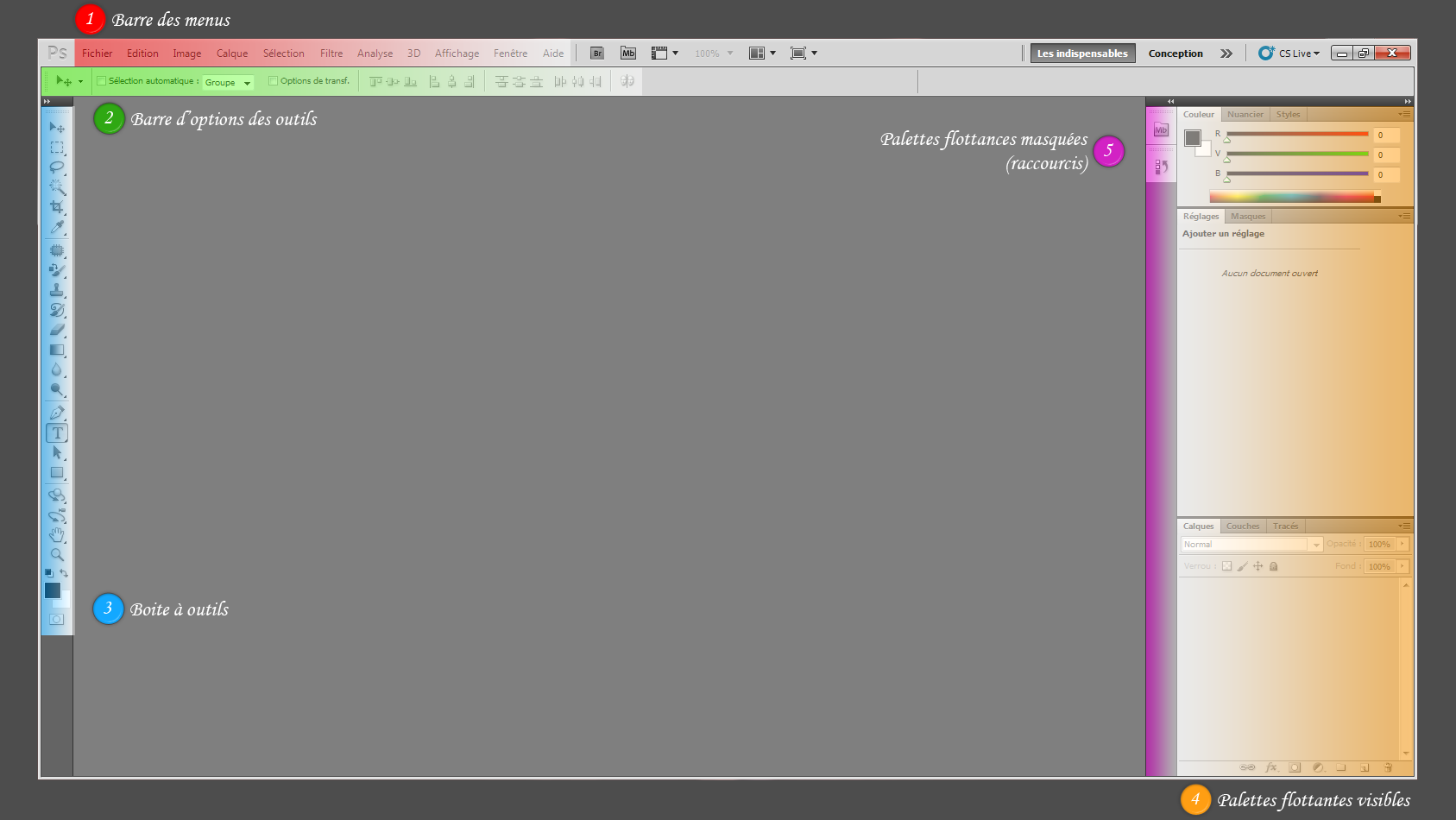 5. Palettes flottantes masquées (raccourcis) : cette zone accueille et recense les raccourcis des palettes flottantes. Le principe est simple : vous déposez toutes les palettes flottantes que vous désirez à l'intérieur de cette petite zone puis elles se transforment en de petites vignettes que vous n'aurez alors plus qu'à "déplier" pour leur faire reprendre une apparence "normale" (comme celles de la partie orange de l'espace de travail ci-dessus, c'est-à-dire que le contenu de la palette devient visible). Ces raccourcis sont très utiles car ils permettent de gagner en lisibilité mais aussi en accessibilité : imaginez s'il fallait afficher en intégralité toutes les palettes flottantes dont nous aurons besoin pour travailler, on n'aurait plus de place et on ne s'en sortirait pas ! Pour afficher le contenu d'une palette miniaturisée, il suffit de cliquer sur la petite vignette qui lui correspond.