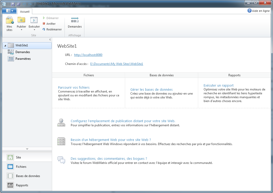 Mes sites : permet d'ouvrir un projet de site web que vous avez déjà créé dans WebMatrix. Pour l'instant, un mini-projet WebSite1 est déjà présent et vous permet de commencer à tester WebMatrix rapidement.