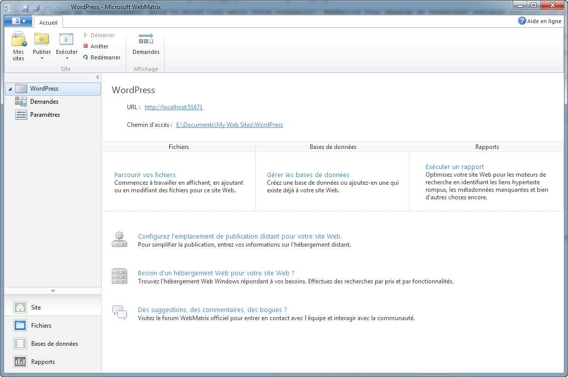 Une fois que c'est fait, votre Wordpress est installé (eh oui, déjà !). WebMatrix ouvre alors sa fenêtre principale que vous connaissez déjà :