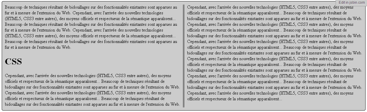 Un autre moyen d'atteindre notre but, de façon plus claire mais compatible avec moins de navigateurs, est d'utiliser les nouvelles propriétés définies avec la norme CSS niveau 3 qui permettent de créer des colonnes de texte dans n'importe quel élément. Nous aborderons ce sujet, accompagné d'un sujet de travaux pratiques, à la fin de ce tutoriel.