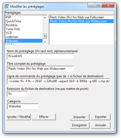 Pour accéder au panneau de gestion des préréglages, allez dans Editer > Préréglages. Sélectionnez la catégorie Websites dans la liste de gauche. Vous pouvez alors éditer un des deux préréglages Flash Video.