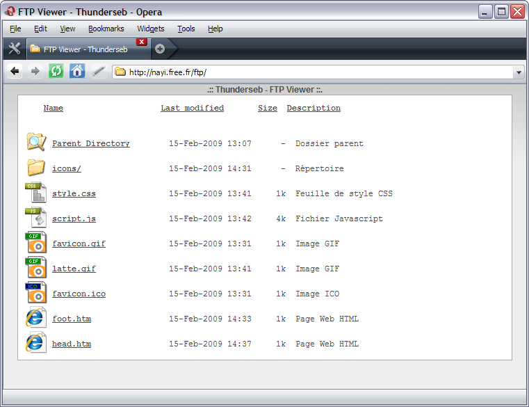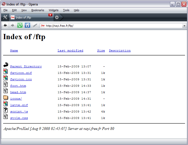 Quand vous naviguez dans votre FTP, Apache génère la liste des fichiers du répertoire que vous visitez. Cette liste va alors être ajoutée au code de head.htm. A tout cela, le code de foot.htm sera ajouté, ce qui donnera au final une page complète. Voici ce que ça peut donner :