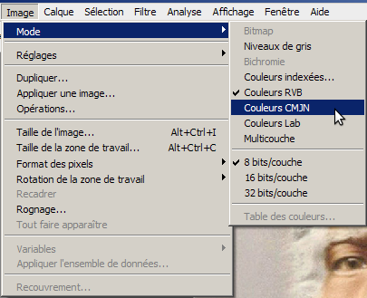 Ici, mon image est en RVB, je vais donc la passer en CMJN. Pour cela on va dans Image > Mode et on sélectionne CMJN.