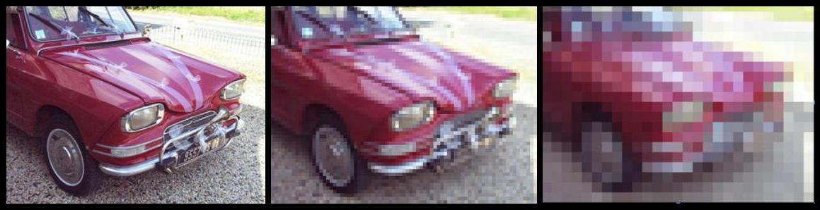 Une même image avec une résolution qui diminue vers la droite (Wikimedia commons). La densité de pixel ou résolution d'une image correspond au nombre de pixels définis dans un espace clos. En clair, on l'exprime souvent en Points Par Pouce (PPP) ou en Dot Per Inche (équivalent anglais). C'est un nombre qui nous renseigne sur la quantité d'informations qui sert à décrire une image. Si ce nombre est faible, on a peu d'informations par pouce et donc celles-ci vont avoir tendances à se voir si on se rapproche du support. Par exemple, lorsque vous vous approchez de votre télé vous allez pouvoir discerner les couleurs (RVB) qui composent l'image affichée. Cela à été conçu de telle manière à ce qu'à une certaine distance normale d'utilisation un humain ne peut discerner les pixels.