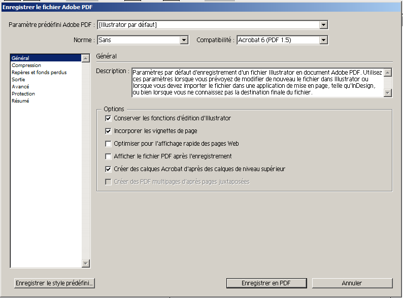 Ensuite on arrive sur cet écran où l'on peut régler de nombreux paramètres. Pour commencer, nous allons charger le Paramètre prédéfini "Qualité Supérieure" dans la liste déroulante. Cela configure de façon correct la plupart des paramètres. La seule chose qu'il reste à changer sont les traits de coupes. Pour cela il faut se rendre dans la section "Repères et fond perdus" et cocher "Traits de coupe" ainsi que de mettre les fonds perdus aux valeurs que vous avez utilisé dans vos débord (3mm pour ma part). On clique sur Enregistrer en PDF et c'est bon. ;)