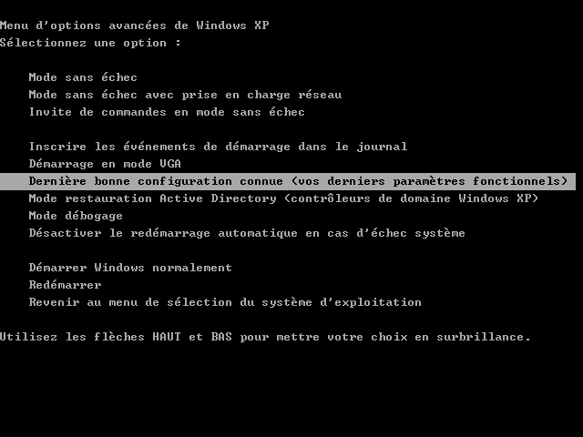 Dans le menu qui apparaît alors, sélectionnez Dernière bonne configuration connue (vos derniers paramètres fonctionnels), puis appuyez sur Entrée. Windows redémarre alors en chargeant un point de restauration, et vous aurez de nouveau accès à Windows .