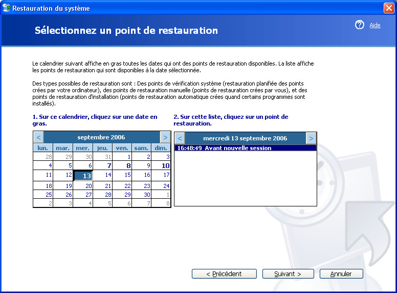 Sélectionnez alors dans le calendrier la date du point de restauration à utiliser dans la partie de gauche, et sélectionnez le nom du point de restauration à utiliser dans la partie droite, puis cliquez sur Suivant. Votre ordinateur va s'éteindre, et au moment où il sera écrit Fermeture de Windows, une fenêtre va apparaître indiquant l'avancement de la restauration.
