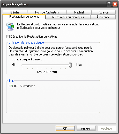 Cochez la case Désactiver la Restauration du système et cliquez sur Appliquer. Attendez le temps de la suppression des points de restauration, puis décochez cette case et cliquez de nouveau sur Appliquer, puis sur OK.