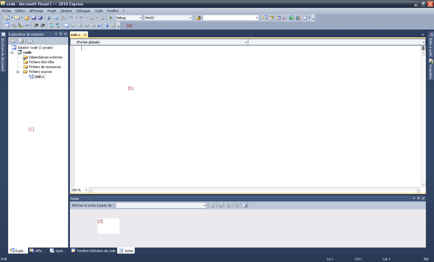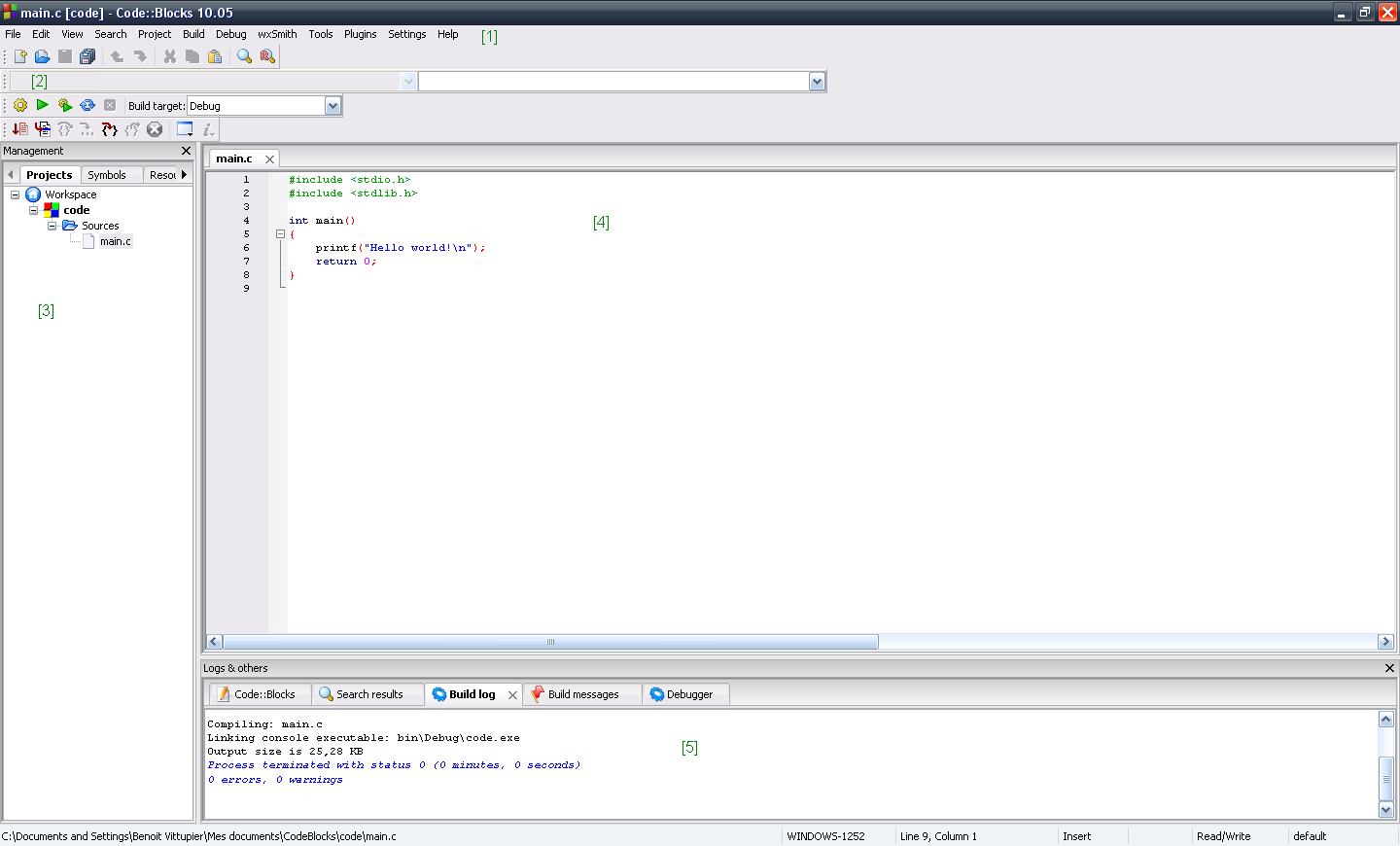 Code::Blocks est un IDE gratuit et libre (vous pouvez obtenir le code source du logiciel si vous le souhaitez), qui fonctionne avec plusieurs compilateurs différents et qui n’est pas très compliqué à prendre en main. Il n’est cependant disponible qu’en anglais (bien qu’il existe des traductions incomplètes en français) ; néanmoins, avec un dictionnaire et de l’intuition, vous vous en sortirez très bien.